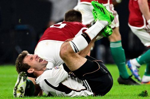 Die deutsche Fußball-Nationalmannschaft um Thomas Müller (Foto: AFP) hat in der Nations League 0:1 gegen Ungarn verloren. Es war die erste Niederlage unter Bundestrainer Hansi Flick. Deutschland präsentierte sich beim letzten Heimspiel vor der Weltmeisterschaft in Katar besonders in der ersten Halbz
