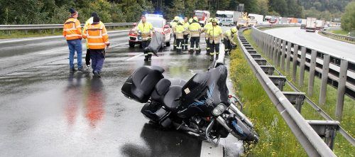 Schwerer Motorradunfall gestern Nachmittag gegen 14 Uhr auf der A 8, nahe der Ausfahrt Irschenberg. Ein 62-jähriger norwegischer Motorradfahrer geriet mit seiner Harley-Davidson vermutlich aufgrund der regennassen Fahrbahn ins Schleudern und verlor die Kontrolle über sein Gefährt. Er stürzte und rut