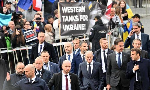 Im Schatten des Krieges berieten am Freitag die EU-Staatschefs. Im Mittelpunkt stand die Energie – aber beim Rundgang durch Prag wurden von Demonstranten Panzer für die Ukraine gefordert. Russland warnte vor einem 3. Weltkrieg, US-Präsident Biden vor einem „Armageddon“.   epa
