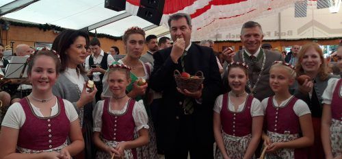 Wenn es darum geht, Kompromisse zu finden, müssen Politiker oftmals in den sauren Apfel beißen. Der gestrige Termin – die Eröffnung des Bad Feilnbacher Apfelmarkts nach zweijähriger coronabedingter Pause – hat Landwirtschaftsministerin Michaela Kaniber (links) und Ministerpräsident Markus Söder (Mit