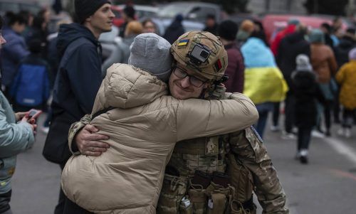 Kurzes AufatmenEine Frau umarmt einen ukrainischen Offizier im befreiten Cherson. In der ganzen Ukraine wurde der Rückzug der russischen Truppen aus der Region gefeiert. Jetzt beginnt das große Aufräumen. 2000 Minen seien entschärft worden, sagte Präsident Selenskyj. Die Zerstörungen seien massiv. F