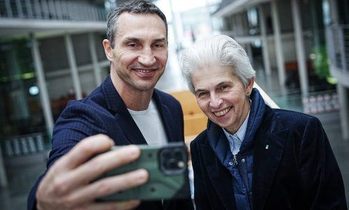 Selfie trotz ernster Zeiten Es wirkt, als habe Ex-Boxer Wladimir Klitschko bei seinem Besuch im Bundestag viel Spaß – hier mit Marie-Agnes Strack-Zimmermann (FDP). Doch tatsächlich war es ihm bitter ernst: Der Ukrainer bat um weitere Hilfe für sein Land: „Das Leiden muss ein Ende haben.“ Foto: Nietf