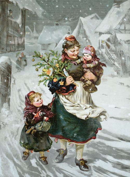 Zauber der WeihnachtEine Mutter stapft mit ihren Kindern am Heiligen Abend durch den Schnee. Sie hat einen geschmückten Zweig dabei. Es ist ein Bild voller Vorfreude. Der Druck entstand im Jahr 1886. Ganz so schneereich werden unsere Festtage heuer nicht werden. Aber dafür haben wir eine Zeitung vol