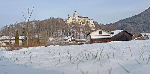 Lang wurde er erwartet, nun ist er endlich da, der Winter. Auch wenn die Landschaft bislang nur leicht überzuckert ist, so ergibt sich doch gleich ein besonderes Landschaftsbild, wie hier am Fuße von Schloss’ Hohenaschau in Aschau im Chiemgau. Für die nächsten Tage besteht laut Wettervorhersage die