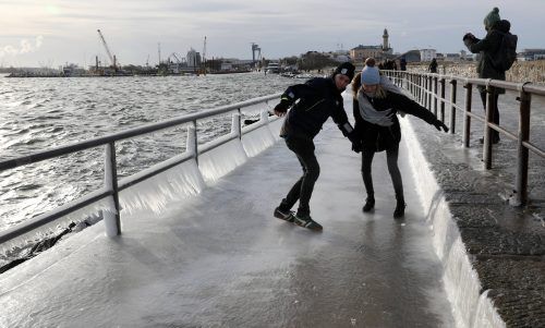 Deutschland rutscht Glatteis und gefrierender Regen haben in weiten Teilen Deutschlands zu unfreiwilligen Rutschpartien geführt. Nicht immer war die Fortbewegung so schwierig wie hier an der Ostsee, aber auch in Bayern gab es Einschränkungen und zahlreiche Unfälle. Foto: dpa