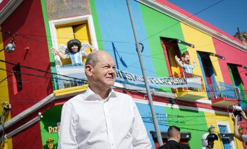 Diego im RückenHeute schon in Brasilien, war Olaf Scholz zuvor in Chile und Argentinien zu Gast. Beim Auftakt seiner Südamerika-Reise hatte der Kanzler in Buenos Aires Rückendeckung von oben. Hinter ihm prangt eine Plastik des verstorbenen Fußball-Helden Diego Maradona – auch genannt „die Hand Gotte