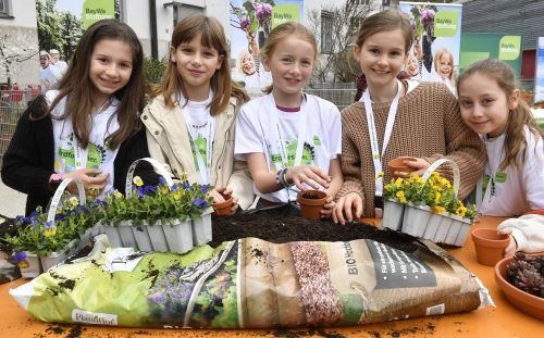 Klimaschutz ohne Kleben Wie funktioniert eigentlich Klimaschutz? Eine Antwort auf diese Frage bekommen Kinder der Münchner Grundschule an der Gebelestraße bei einem neuen Bildungsprojekt der BayWa-Stiftung. Hier pflanzen Ayuni, Maximiliana, Carlotta, Holly und Flavia (v. li.) Blumen ein.