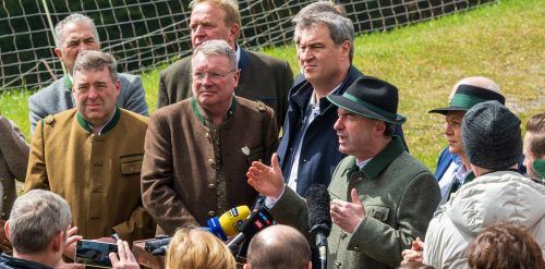 Daumen runter für den Wolf, Daumen hoch für die Almbauern: Bei einem Ortstermin am Berggasthof Bichlersee in Oberaudorf am gestrigen Vormittag informierten Ministerpräsident Markus Söder und Tourismusminister Hubert Aiwanger (unser Bild) über die Wolfsverordnung. Es ging um den Bär – und einiges meh