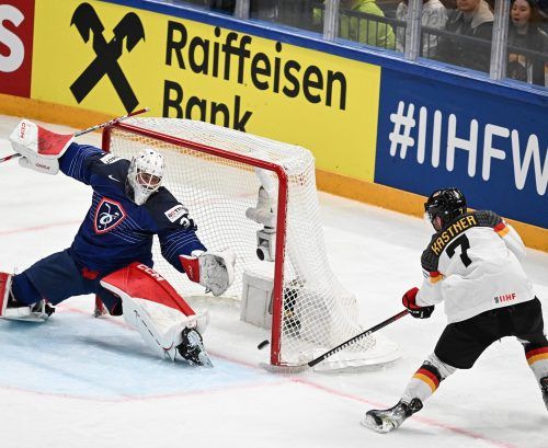 Mit dem vierten Sieg in Folge haben die deutschen Eishockey-Nationalspieler das WM-Viertelfinale erreicht: Das Team von Harold Kreis gewann zum Vorrundenabschluss gegen Frankreich mit 5:0 – den Schlusspunkt setzte der Münchner Maxi Kastner (Foto: EPA). Gegen den Erzrivalen Schweiz geht es am Donners