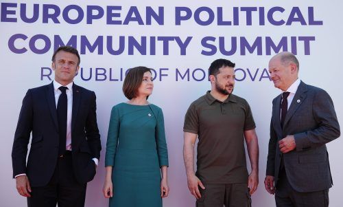Gipfel der GeschlossenheitBei einem Treffen in Moldau, nahe der Grenze zur Ukraine, haben westliche Staats- und Regierungschefs wie Olaf Scholz (r.) und Emmanuel Macron (l.) der moldauischen Präsidentin Maia Sandu und Wolodymyr Selenskyj weitere Unterstützung zugesagt. Foto: Nietfeld/dpa