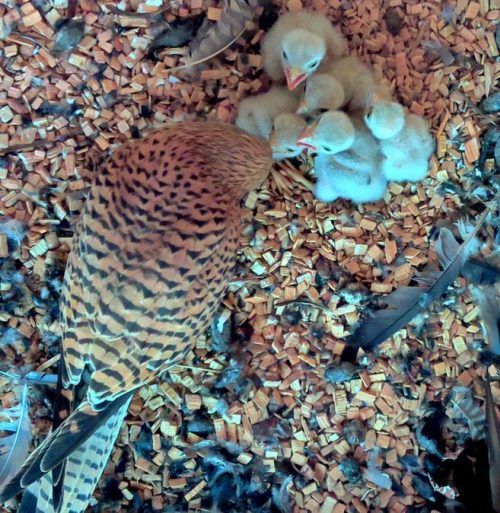 Große Freude in Rosenheim: Die Turmfalken in St. Nikolaus haben süßen Nachwuchs bekommen (unser Bild). Besonders stolz darüber ist Erwin Heigl, Leiter des Projekts „Rosenheimer Stadtfalken“. Jetzt sei vor allem der Papa der wuscheligen Kleinen gefordert: Er muss das Futter für seinen Nachwuchs heran