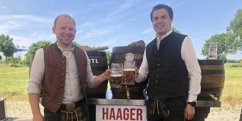 Überraschung bei der Vorstellung des Programms für das 12. Haager Herbstfest vom 29. September bis 8. Oktober: Veranstalter Bernd Furch übergibt an Manuel Scheyerl (rechts) und Stefan Staudinger von der Firma SAS. Beide Zelte werden viel größer als 2022. Die Location von Christian Lettl erhält einen