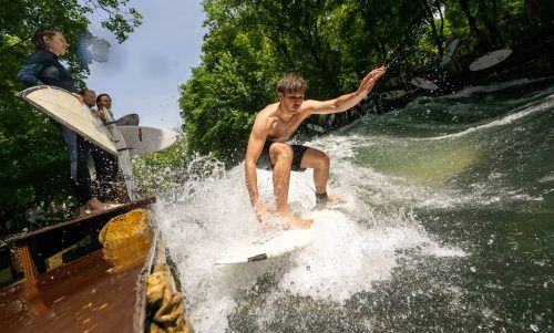 Manche mögen’s heißAuf der Eisbachwelle im Englischen Garten lässt es sich gut aushalten, denn die Meteorologen erwarten heute in Bayern Temperaturen von bis zu 37 Grad. Es könnte der bisher heißeste Tag in diesem Jahr werden. Morgen sollen Gewitter für Abkühlung sorgen. Kneffel/dpa