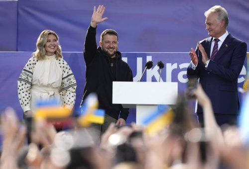 Tausende Menschen haben dem ukrainischen Präsident Wolodymyr Selenskyj zugejubelt, als er am Rande des Nato-Gipfels in Vilnius seine Rede hielt. „Die Nato gibt der Ukraine Sicherheit, die Ukraine macht die Nato stärker“, rief er neben seiner Frau Olena Selenska und dem litauischen Präsidenten Gitana