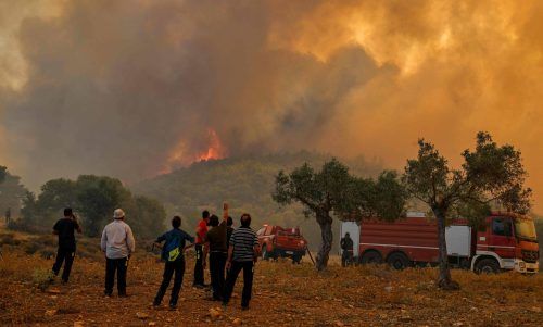 Kampf gegen die Flammen Hunderte Feuerwehrleute versuchen weiterhin, die Waldbrände in der Nähe von Athen unter Kontrolle zu bekommen. Starke Winde und eine Hitzewelle erschweren die Arbeit. Ein Meteorologe warnte: „Das Schlimmste steht uns noch bevor.“ Foto: AFP/Gouliamaki