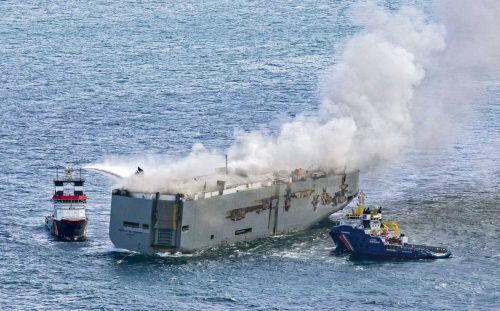 Sorge in der Nordsee Ein mit 3000 Autos beladenes Frachtschiff hat vor der niederländischen Insel Ameland Feuer gefangen. Ein Mann wurde getötet. Die „Fremantle Highway“ hat Schlagseite und könnte sinken. Experten warnen vor einer Umweltkatastrophe für die Nordsee. Foto: epa