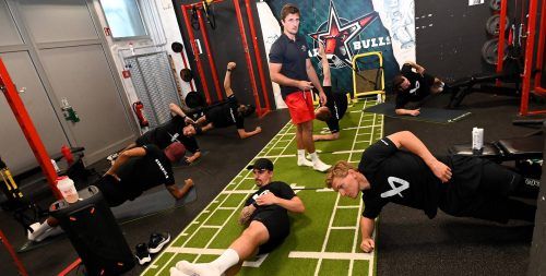 Pünktlich am 1. August sind die Starbulls-Eishockeyspieler in die Vorbereitung gestartet. Nach einem Aufwärmprogramm und Stabilisationsübungen (Bild) mit Athletik-Coach Florian Schillhuber (Mitte) ging es mit schweren Gewichten gleich richtig zur Sache. Vorne auf dem Bild zu sehen Manuel Strodel und