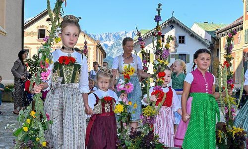 Kräuter für MariaStolz haben Mädchen und Buben gestern ihre selbst gebundenen Kräuterbuschen durch Partenkirchen getragen. Vor der Messe wurden sie vom Pfarrer gesegnet. An Mariä Himmelfahrt bringen Gläubige zu Ehren Marias zu Sträußen gebundene Kräuter mit zum Gottesdienst. foto: Thomas sehr