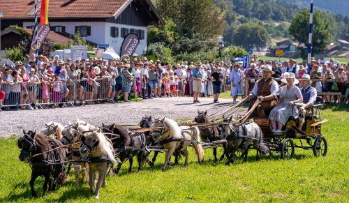 Bahn frei für die Mini-Shettys– beim Internationalen Zehnerzugtreffen der Pferdefreunde Leitzachtal waren die kleinen Vierbeiner ein echter Hingucker. Insgesamt 20 Zehnerzüge lockten tausende Besucher nach Hundham im Landkreis Miesbach. Foto: Max Kalup