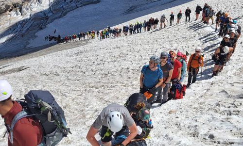 Schlange stehen am Gipfel:100 Bergsteiger warten am Höllentalferner unterhalb des Zugspitzgipfels, um über die berüchtigte Gletscherrandspalte auf den Klettersteig zu gelangen. Die Wartezeit: bis zu drei Stunden. Für Bergwacht und Bergführer ist das in den Ferien Alltag. Foto: Vivalpin/Facebook