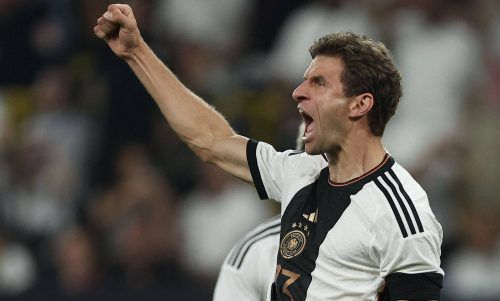 Starke Reaktion Zwei Tage nach der Entlassung von Bundestrainer Hansi Flick hat die deutsche Nationalmannschaft ein überraschendes Erfolgserlebnis gefeiert. Durch Tore von Thomas Müller (Foto) und Leroy Sane besiegte das DFB-Team den WM-Zweiten Frankreich in Dortmund mit 2:1. Foto: afp