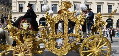 Sie war ein besonderer Blickfang beim gestrigen Trachten- und Schützenzug zum Oktoberfest: die königliche Goldkutsche aus dem Film „Ludwig II.“. Kini-Darsteller Otto Heitauer aus Gstadt in dem prunkvollen Gefährt sowie seine beiden „Pagen“ (von rechts) Kurt Lehner und Armin Kämmer, die beiden Bürger