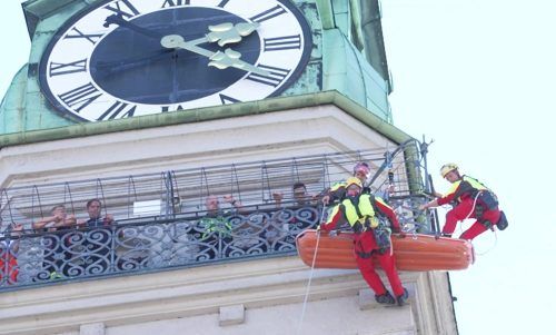 Rettung vom Alten Peter Spektakuläre Rettungsaktion gestern am Alten Peter in der Münchner Altstadt: Eine ältere Frau mit gesundheitlichen Problemen musste durch die Feuerwehr von der Aussichtsplattform des Kirchturms abgeseilt werden. Die Retter arbeiteten in 56 Meter Höhe.