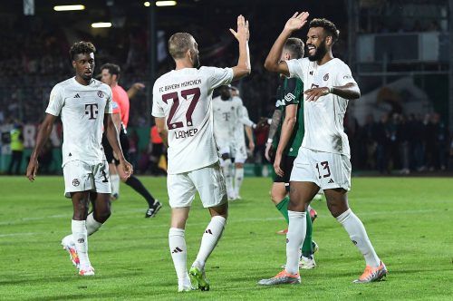 Das ging so locker und leicht wie erhofft: Mit einem nie gefährdeten 4:0-Sieg bei Drittliga-Aufsteiger Preußen Münster ist der FC Bayern im Nachholspiel am Dienstagabend in die zweite Hauptrunde des DFB-Pokal eingezogen. Auf dem Foto klatschen sich Konrad Laimer und Eric Maxim Choupo-Moting ab, beid