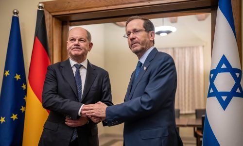 An der Seite IsraelsOlaf Scholz ist als erster Regierungschef nach den Hamas-Attacken in Israel eingetroffen. Präsident Izchak Herzog (re.) würdigte den Besuch des Kanzlers als „enormen Ausdruck von Solidarität“. Scholz’ Reise musste mehrmals wegen Raketenangriffen unterbrochen werden. Foto: afp/Kap