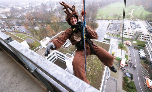Rentier im AnflugNicht nur der Nikolaus ist in diesen Tagen unterwegs und verteilt Geschenke. In Mönchengladbach verkleiden sich Höhenretter der Feuerwehr auch als Rentier, Elfe, Superman und Batman, um sich an den Städtischen Kliniken abzuseilen und kleine und große Patienten zu erfreuen. Foto: dpa