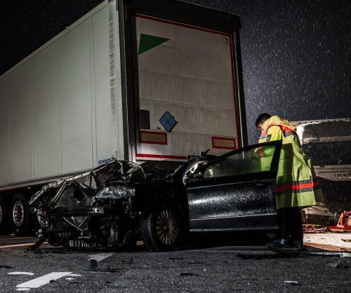 Der heftige Wintereinbruch hat auch am vierten Tag in Folge im Süden Bayerns zu Unfällen und Behinderungen im Verkehr geführt. Weil die A 8 bei Odelzhausen in der Nacht auf Dienstag spiegelglatt war, rutschte das Auto von zwei Rumänen auf der Durchreise unter einen quer stehenden Lastwagen (Foto). D