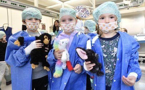 Einsatz für die Teddy-DocsDie München Klinik hat rund 140 Vor- und Grundschulkinder eingeladen, um ihnen zu erklären, wie gefährlich Feuer sein kann. Ben, Emily und Johanna lernten auch, wie man Brandwunden verarztet. Ihre Patienten brachten sie selbst mit: Kuscheltiere. Foto: Marcus schlaf