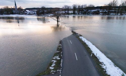 Land unterTauwetter und Regen lässt immer mehr Flüsse über die Ufer treten – wie auf dem Bild die Vils in Niederbayern. Der Hochwassernachrichtendienst rechnet weiterhin mit steigenden Pegelständen. In Oberbayern ist die Lage weniger dramatisch, doch auch hier gab es einige Einsätze von Rettungskräf