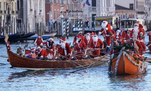 Auf Weihnachts-KursIn Venedig schwärmen sie schon aus – Weihnachtsmänner und -frauen in typischen Ruderbooten auf dem Canal Grande. Die venezianische Rudergesellschaft legt sich in die Riemen. Die ganze Aufmerksamkeit richtet sich auf die Aktion, da hat das Christkind im Verborgenen freie Bahn. epa