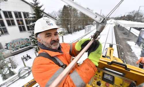 Eisiger Einsatzfür die S-Bahn: Elektriker Ali Tutkun schraubt am Bahnhof Daglfing im Münchner Osten die Oberleitung fest. Noch eine Woche ist die Strecke der S8 zum Flughafen unterbrochen, weil die Bahn den Fahrdraht erneuert und die Strommasten ersetzt – diese stammen aus dem Jahr 1939. Foto: Marc