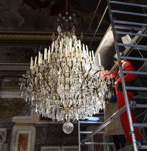 Eine besondere Restaurierung stand kürzlich im Neuen Schloss auf Herrenchiemsee an: Der fast drei Meter hohe und zwei Meter breite Lüster im Gardesaal wurde von einem Gerüst aus von einer Fachfirma überholt, unter anderem um die originale Verdrahtung des Leuchters aus dem Jahr 1883 mit seinen insges