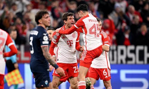 Torreich ins ViertelfinaleDer FC Bayern München hat den Kopf noch einmal aus der Schlinge gezogen. Nach dem souveränen 3:0-Sieg gegen Lazio Rom steht die Elf von Trainer Thomas Tuchel trotz der Hinspiel-Niederlage (0:1) im Viertelfinale der Champions League. Foto: ulmer