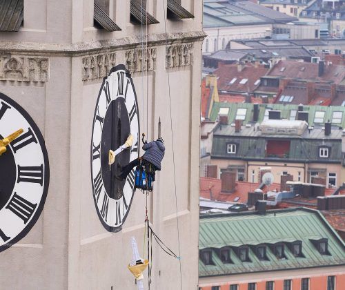Münchens älteste Stadtpfarrkirche Sankt Peter verfügt wieder über einen funktionierenden, kompletten Uhrensatz. Wegen heftiger Sturmböen hatte sich Anfang November das Zeigerpaar am unteren Ziffernblatt der Uhr auf der Westseite ineinander verhakt und musste abmontiert werden. Gestern hat der Alte P