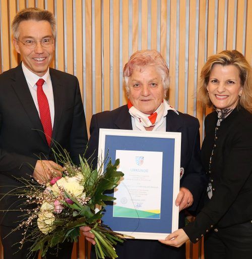 Der Sozialpreis des Landkrei-ses Rosenheim geht an den „Ball für Menschen mit Behinderung und Senioren“, der vom BRK-Kreisverband ausschließlich durch ehrenamtliche Helfer veranstaltet wird. Landrat Otto Lederer (links) und Bundestagsabgeordnete Daniela Ludwig (rechts) zeichneten stellvertretend für