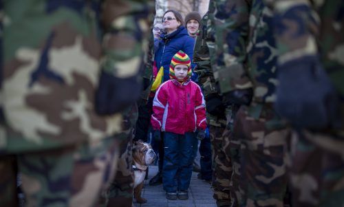 Ein Fest in unsicheren ZeitenEin Kind mit einer Mütze in den Farben der litauischen Flagge steht zwischen Soldaten: Litauen feiert den 34. Jahrestag seiner Unabhängigkeitserklärung von der Sowjetunion – aber fühlt sich derzeit extrem bedroht vom Nachbarn. Foto: Kulbis