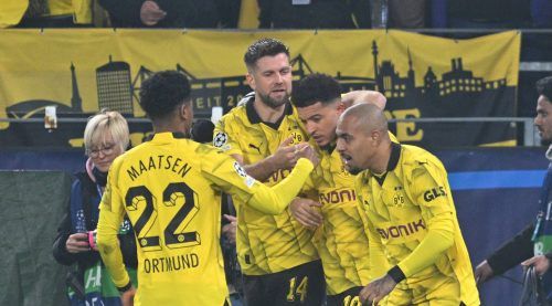 Jadon Sancho (2.v.r.) hat Borussia Dortmund ins Viertelfinale der Champions League bugsiert. Der Engländer brachte den BVB beim 2:0 über PSV Eindhoven bereits in der dritten Minute auf Kurs. Marco Reus machte in der Nachspielzeit dann alles klar.