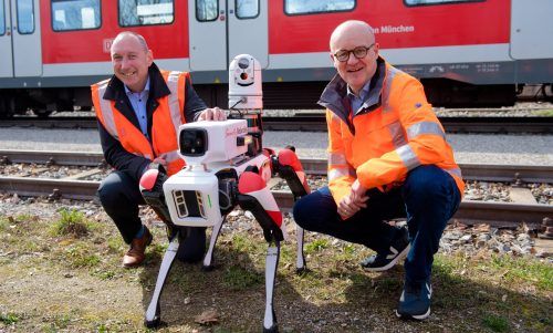 „Spot“ auf Sprayer-JagdMehr als 20 000 Graffiti werden jedes Jahr auf Züge gesprayt. Der Schaden geht in die Millionen. Abhilfe soll nun in München ein Roboterhund schaffen. Den Vierbeiner „Spot“ stellten S-Bahn-Chef Heiko Büttner (r.) und Torsten Malt von der DB Sicherheit vor. FOTO: RObert Broucze