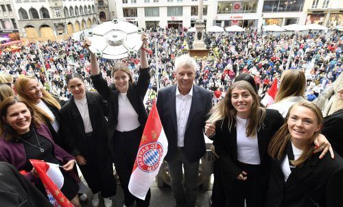 Hier ist die Bayern-Meisterfeier!Eine Saison ohne Titel, ohne Triumph auf dem Rathausbalkon? Nicht doch! Die Meister-Frauen des FC Bayern haben am Dienstag ihren Titel standesgemäß auf dem Marienplatz gefeiert, mit Schale und Oberbürgermeister. Foto: Marcus Schlaf