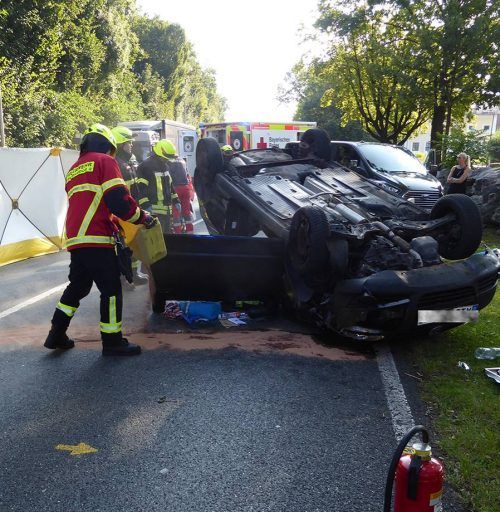 Ein schwerer Unfall hat sich gestern Morgen auf der Staatsstraße 2078 in Kolbermoor ereignet (Foto: Riedinger). Ein Autofahrer war aus noch ungeklärter Ursache auf die Gegenfahrbahn geraten und auf Steine gekracht, die sich dort am Fahrbahnrand befinden. Das Auto überschlug sich daraufhin und blieb
