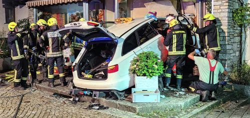 Spektakulärer Unfall am Mittwochabend in Ruhpolding: Weil eine 56-Jährige offenbar Gas- und Bremspedal verwechselte, fuhr die Frau auf einen Bordstein auf und wurde durch ihre Geschwindigkeit förmlich durch die Luft katapultiert. Das Fahrzeug landete im Schaufenster eines Schuhgeschäfts (Foto: Feuer