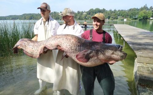 2,51 Meter lang und 95 Kilo schwer: Diesen gigantischen Wels hat Tim Kosian (rechts) aus dem Pilsensee gefischt. Hier präsentiert er den Fang mit seinen Fischervereinskollegen David Grundei (l.) und Vitus Schneider. Was aus dem Riesen-Wels wurde, lesen Sie im Bayernteil.
