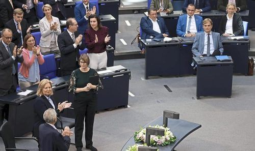 Stehende Ovationen gab es gestern im Parlament nach der Rede der Historikerin Christina Morina (3.v.l.), die bei der Feier zum 75-jährigen Bestehen des Bundestags vor antidemokratischen Strömungen warnte. Schweigend quittierten die AfD-Abgeordneten den Beitrag. Sie hatten die Rede mehrfach mit Zwisc