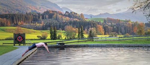 Der Herbst bringt in diesen Tagen ruhiges und für die Jahreszeit warmes Wetter in die Region. Zur Freude der Einheimischen und ihrer Gäste. Am idyllischen Naturbad am Samerberg genoss die Familie Wettendorf jüngst ihren Herbsturlaub. Trotz eher kühler Temperaturen sprang Familienvater Tobias, angefe