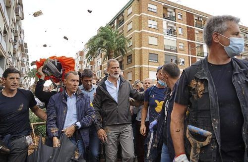 Schlamm, Steine und Eimer flogen durch die Luft., als König Felipe VI. (Mitte) zusammen mit seiner Frau Letizia am Sonntag die Überschwemmungsregion bei Valencia besuchte. „Mörder“, brüllten Menschen dem Königspaar sowie Regierungschef Pedro Sánchez entgegen. Unterdessen machten sich am Wochenende t