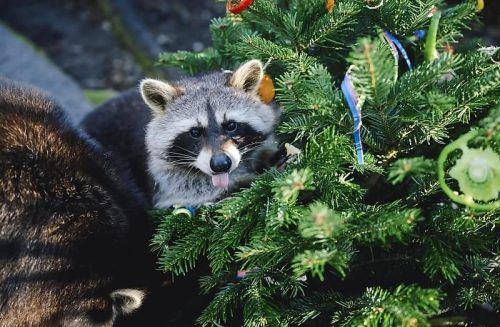 Da staunt der Waschbär: Kurz vor Weihnachten bekommt er, wie viele weitere Tierpark-Bewohner, einen herrlichen Christbaum fürs Gehege. Viel Zeit für andächtiges Staunen bleibt aber nicht, schließlich sind die Tannen mit lauter Dingen geschmückt, die der Waschbär zum Fressen gern hat. Und so leistet